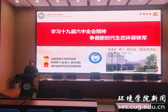 党委书记李素矿以“学习十九届六中全会精神,争做新时代生态环保铁军”为题讲授党课。