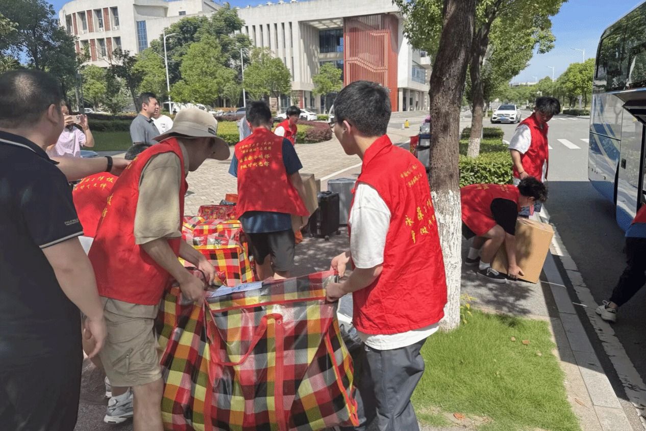 清晨,搬迁工作在南望山校区有序启动。党委副书记王海锋、24级班主任潘欢迎老师和24级辅导员细致组织同学们装车。与此同时,未来城校区接应组也已准备就绪。党委书记姜明敏带领全体学工组辅导员、学生志愿者准备接车。