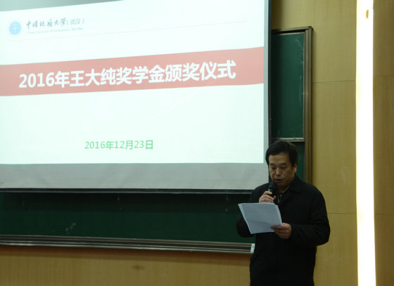 陈飞致辞。他介绍了王大纯基金发起过程与设立目的。并希望获奖同学戒骄戒躁、再接再厉,既要有“一览众山小”的豪迈气概,更要有“山外青山楼外楼”的清醒头脑。要求水工环专业同学要刻苦学习、奋发向上,继承发扬勇攀高峰、敢于担当的地大精神,努力成为像王大纯先生一样的科学家。