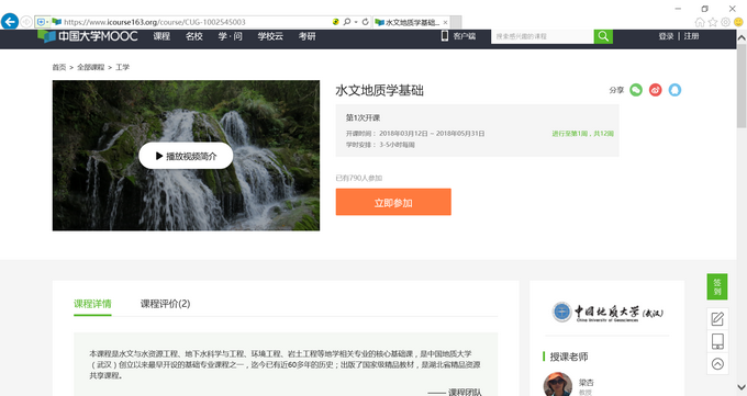 (通讯员罗明明 编辑张学海)近日,由bet365体育投注下载梁杏教授负责的《水文地质学基础》MOOC课程在中国大学MOOC(慕课)优质在线课程学习平台(www.icourse163.org)上线,这是bet365体育投注下载