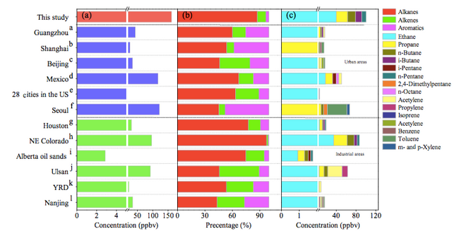 研究发现:油气田地区烷烃是VOCs的重要组成部分,其百分比远远高于城市和石化工业地区(图1),与世界范围内其他油气田地区(North Colorado,Albert oil sand)地区类似。