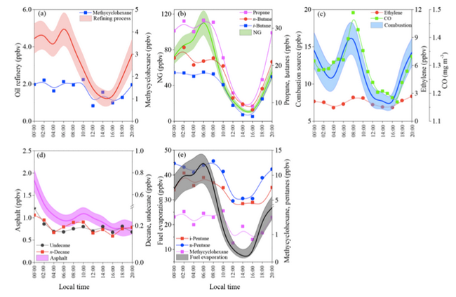 利用高时间分辨率的采样和分析仪器,结合受体模型,本文还给出了各个VOCs源的日夜变化趋势(图3)。结果表明,炼油厂排放、天然气源和燃料挥发源的日夜变化趋势主要受到边界层高度和光化学反应去除的影响,表现为夜间浓度高,白天浓度低。