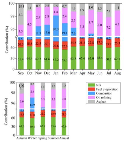油气田地区是人为VOCs排放源的高强度地区,油品挥发与燃烧是VOCs的一个主要来源。2013年国务院发布的大气污染防治行动计划(大气十条)中,对挥发性有机物(VOCs)的治理提出了新的要求。识别VOCs的组成和来源是一项基础工作。现有VOCs的研究主要集中在城市和石化工业地区,多利用低分辨率的离线采样方式,VOCs的时间演化趋势被掩盖。本文基于气相色谱/质谱(GC-FID/MS)对我国西北部一重要油气开采和石化地区开展了为期一年的在线连续监测(2小时分辨率),对VOCs组成及源的高时间分辨率演化进行了系统研究。