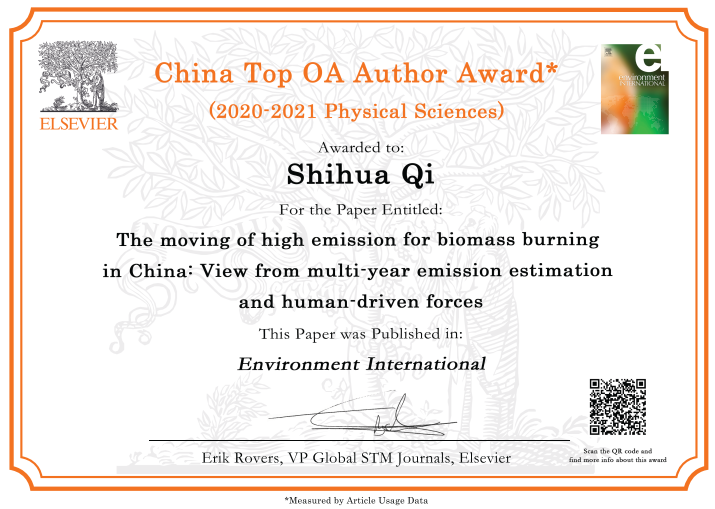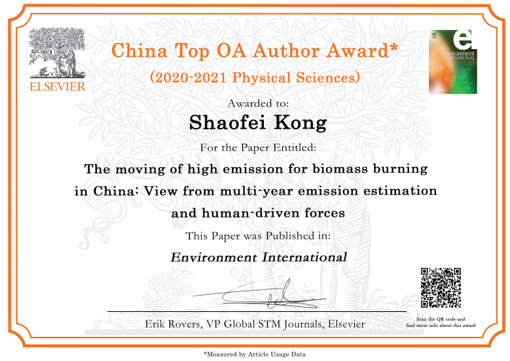 此次评选中,吴剑博士为第一作者,孔少飞教授、祁士华教授为通讯作者在国际知名期刊《Environment International》发表的论文“The moving of high emission for biomass burning in China: View from multi-year emission estimation and human-driven forces”获得同季度(物质科学领域)中国作者论文下载量的前五名。