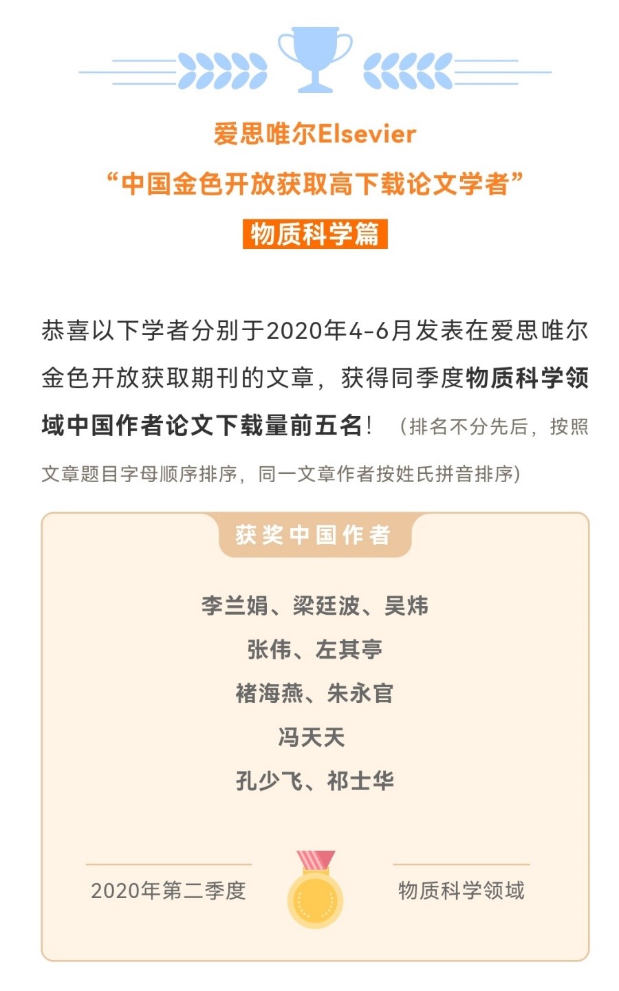 (编辑严丽莎)近日,爱思唯尔(Elsevier)中国金色开放获取高下载论文学者(2020年第二季度物质科学篇)榜单公布,来自国内5个高校、科研单位的10位学者入选该榜单,bet365体育投注下载孔少飞教授、祁士华教授入选。