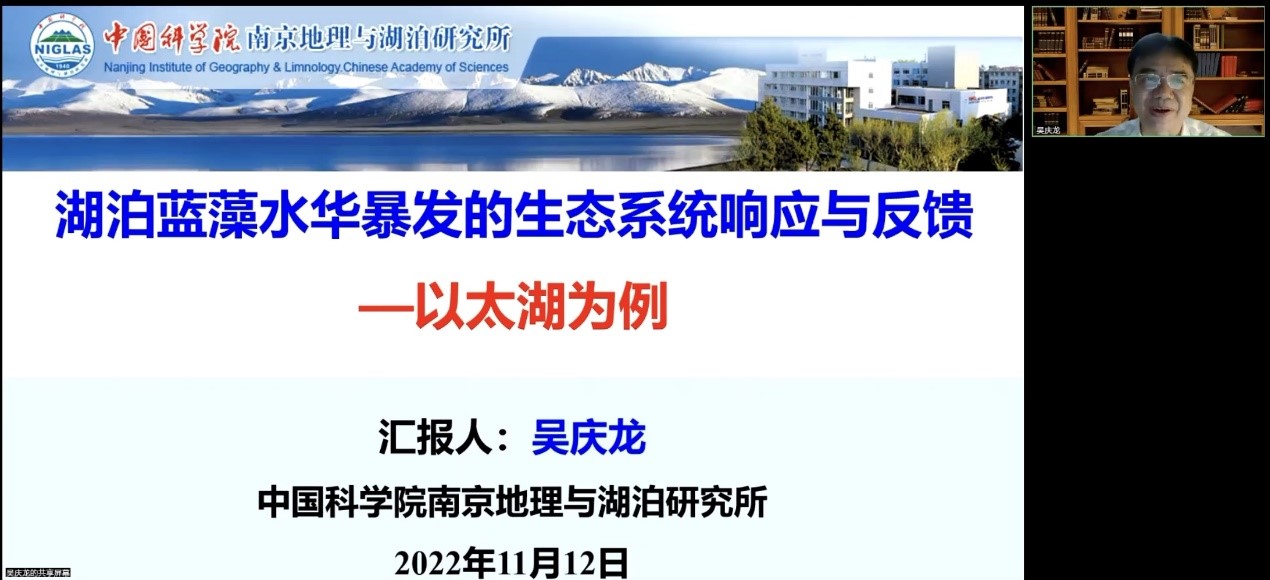 南京地理与湖泊研究所吴庆龙研究员以《湖泊蓝藻水华暴发的生态系统响应与反馈——以太湖为例》为题作线上学术报告。该报告是我校校庆七十周年系列学术报告活动“名家论坛”之一,100余名师生参加。王红梅教授主持报告会。
