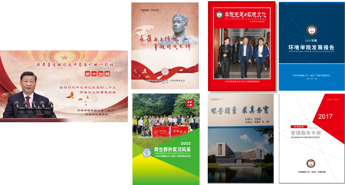 发展报告》《师生野外实习风采展》《“张国旗班”行动计划画册》和《管理服务手册》等“1+6”党建文化产品。“小水滴”、小E在线网络平台、小E有约、“E师亦友”师生茶话会与师生朝夕相伴。“红山雨”师生合唱团歌声嘹亮、党支部风采大赛精彩纷呈,一大批教师、学生典型涌现,各类竞赛摘金夺银。在党员活动室、谈心室、阅读角随处可见环境学子学习身影,环境文化积极健康向上。