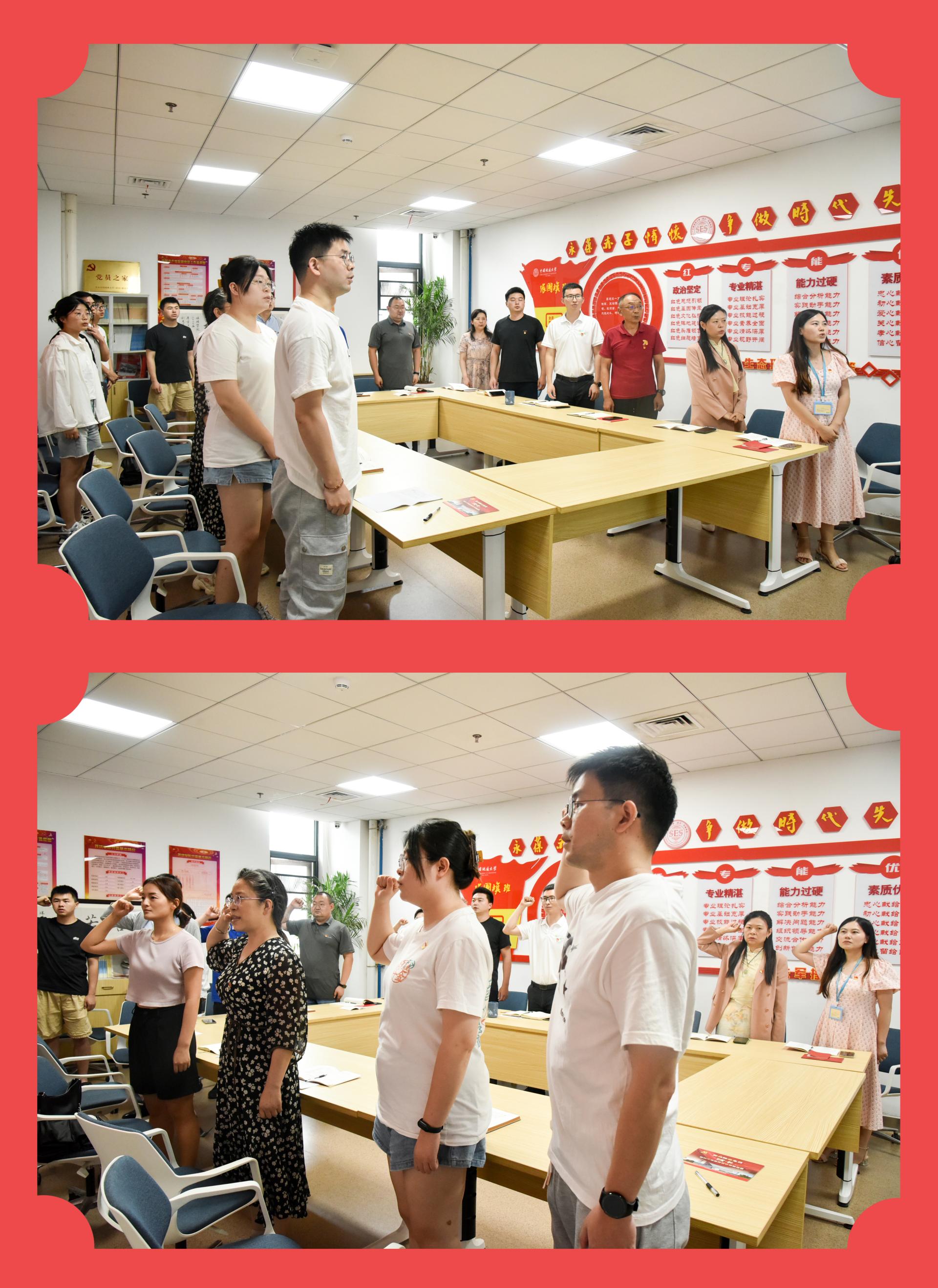 张学海为院直支部王海锋、杨涛、严丽莎、陈俊男同志和2021级博士生党支部的冯智、李越南等颁发政治生日纪念卡。