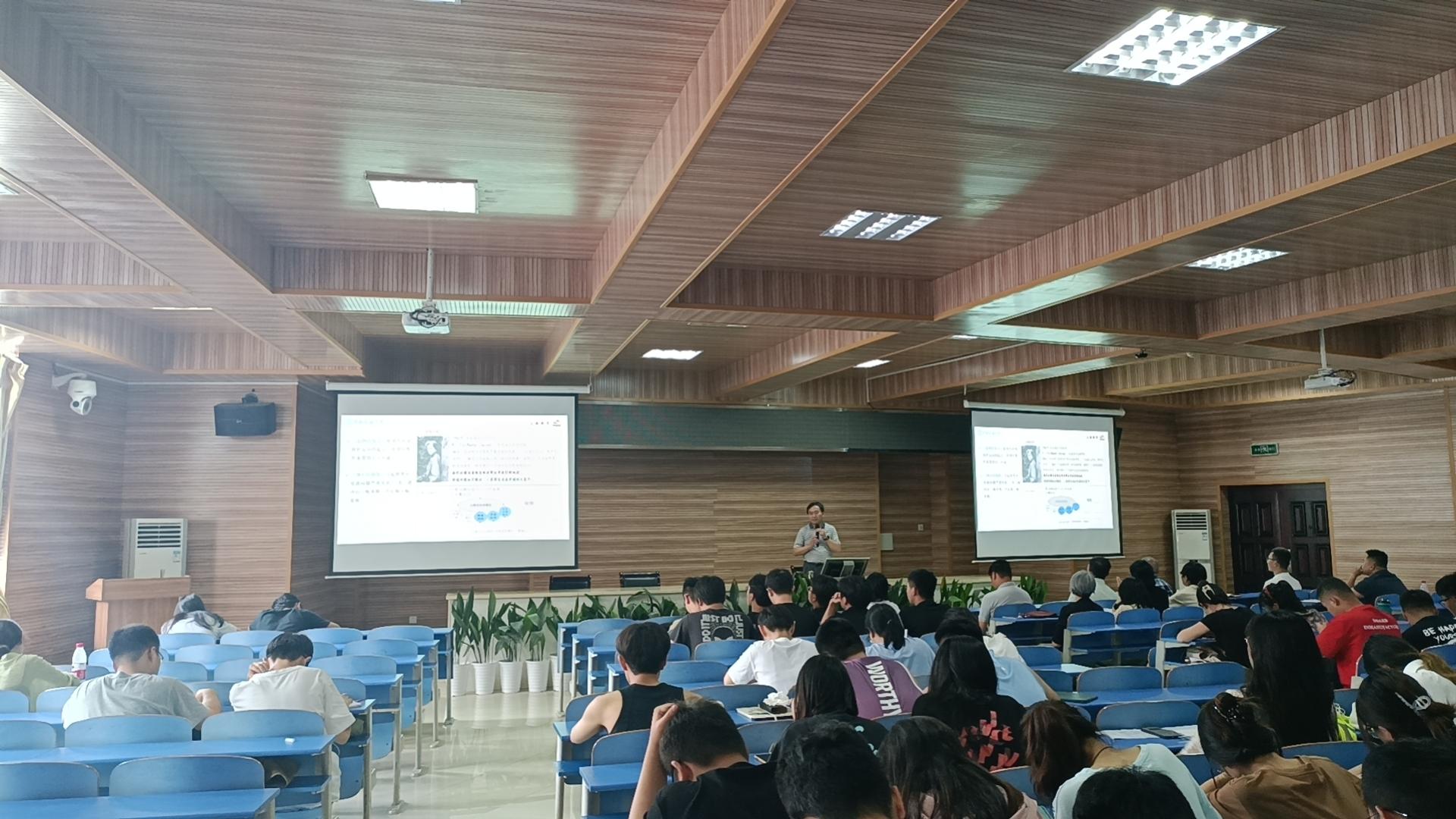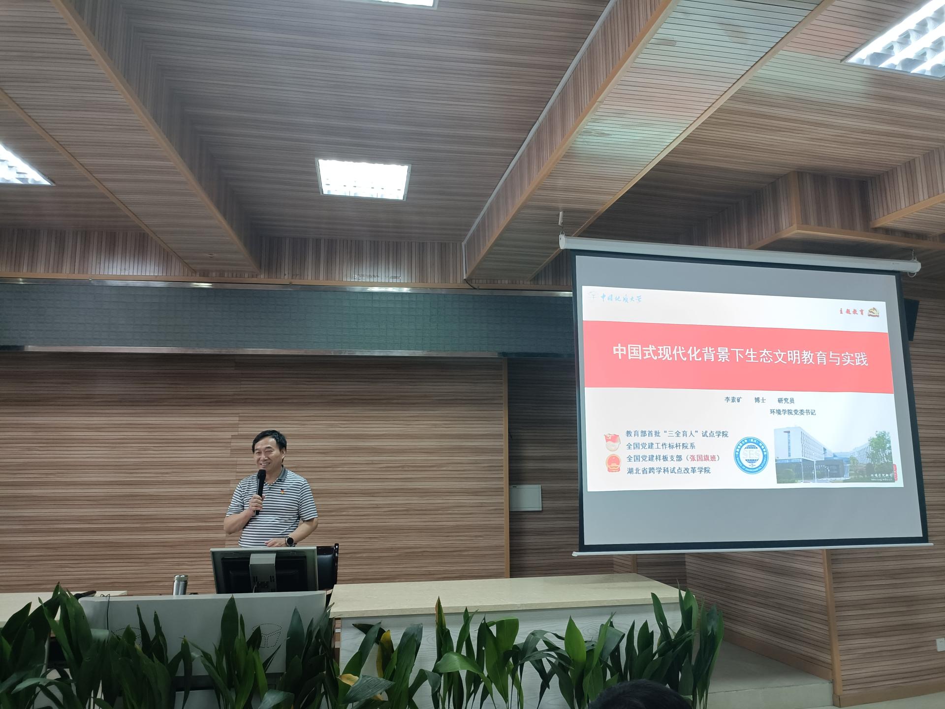 党委书记李素矿以《中国式现代化背景下生态文明教育与实践》为题,为秭归实习队全体师生讲授专题党课。