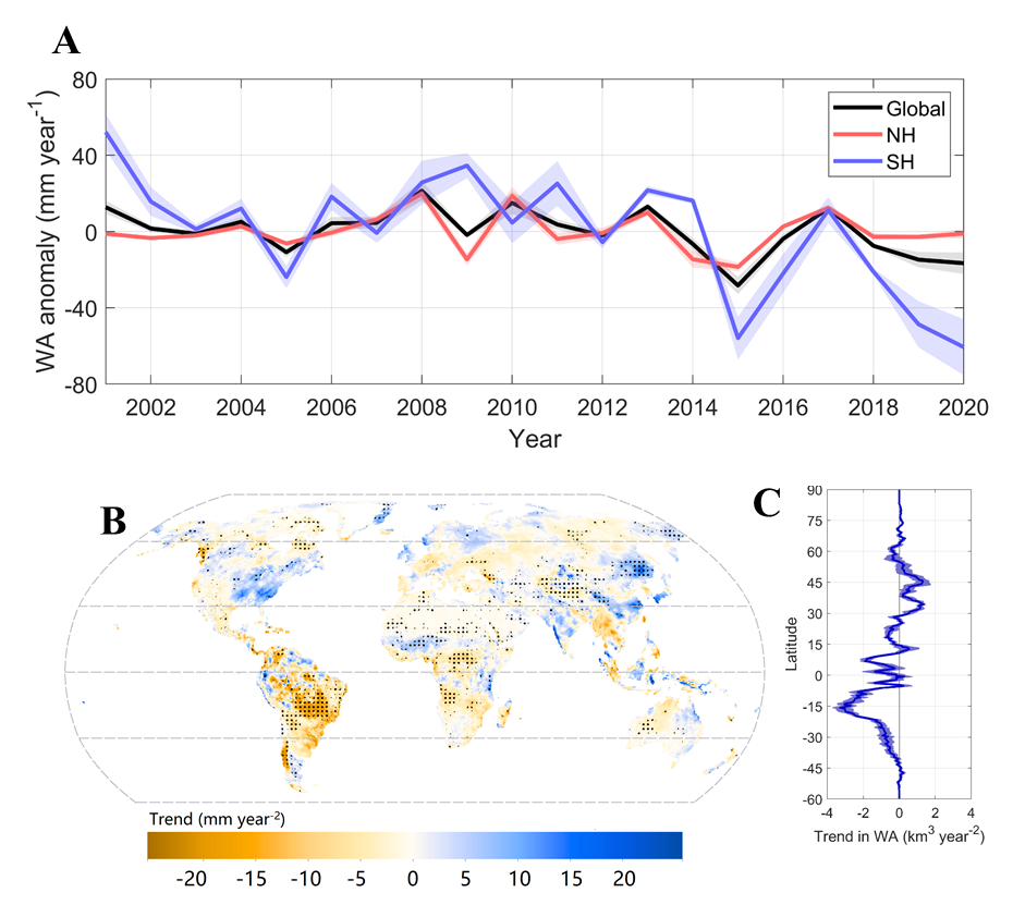 图1. 全球陆地水资源可用性的年际变化和趋势解析。(A)全球陆地水资源可用性的年际变化特征;(B)近20年(2001-2020)全球陆地逐0.5°× 0.5°网格的水资源可用性趋势分布特征;(C)陆地水资源可用性随纬度(逐0.5°)变化的分异特征