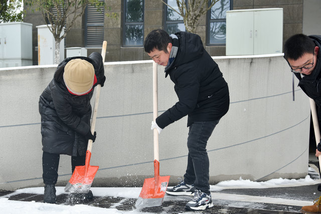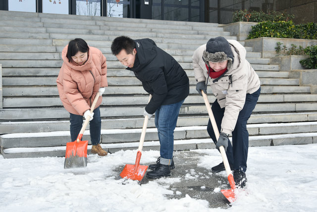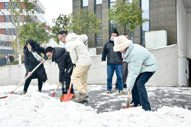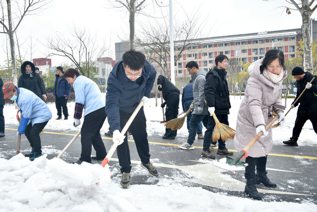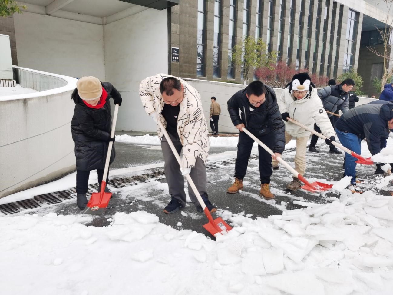 应急突击预备队和院师生开展铲冰除雪行动,清除科教楼四周边道路冰雪。