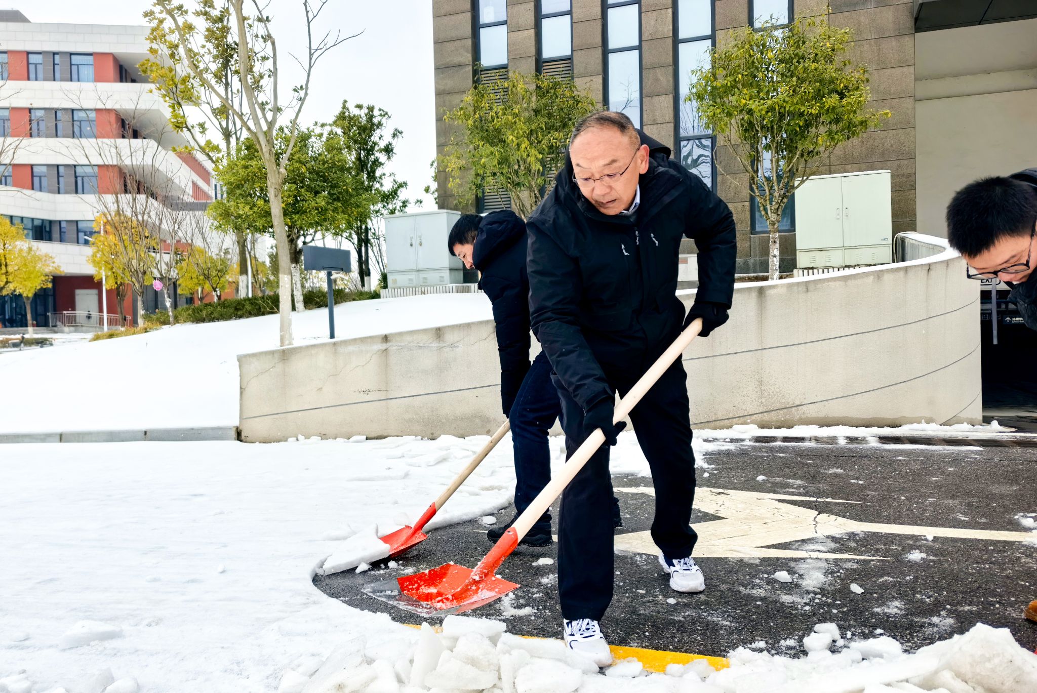 大楼西门、南门、车库入口等主要出入口的冻冰积雪,清扫出一条条“温暖平安路”,为师生出行筑牢安全屏障。