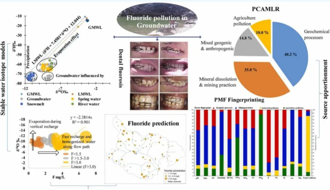 论文系统采收集了96个不同来源的地下水、地表水和岩石样本,通过水文地球化学、稳定同位素、结合矩阵分解(PMF)、主成分分析多元线性回归模型(PCAMLR)技术,综合评估了巴基斯坦吉尔吉特半干旱地区高氟地下水的成因、污染来源以及人体健康风险。研究发现,该地区地下水氟含量严重超标不宜饮用,高氟水产生的主要物源包括水文地质过程、采矿活动、工业生产及农业污染,并建议以上四方面切入点,为解决高氟地下水健康威胁提供针对性的治理策略。
