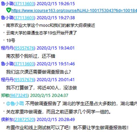 2月18日19:00罗泽娇教授等6位教师的《生态学概论》开课,腾讯会议、腾讯课堂、智慧树等各大平台,老师和学生们都已经熟练掌握。疫情当前,学生们对自然愈发充满好奇和敬畏,期望从《生态学概论》学到生态规律,了解人类与自然和谐的共处之道。新冠疫情、白鲟灭绝、长江禁渔等案例进入了在线课堂。生物系郑敏老师开课前在智慧树发布了讨论话题:野生动物贸易该不该全面禁止?同学们围绕论题从立法、市场监管、加强动物传疫研究与管理、提高公众认知度各个角度纷纷发表了自己的看法。