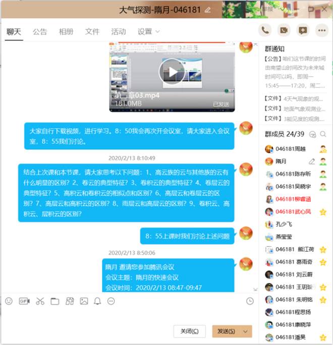 为保证线上教学效果,首先在群公告明确上课要求:1)每次上课前5-10分钟登录qq,确保上课期间通讯正常。2)上课期间,请将通话功能关闭,仅回答问题时开启通话及摄像头。3)点名时请开启通话及摄像头。其次,将上课时间发在群公告上,提醒学生们按时上课。第三,由于学生们没有教材,所以至少提前1天将课件上传到群里,供学生预习。为了督促教师和学生的线上教学,大气系的系主任李双林老师、支部书记孔少飞老师、046181班主任顾西辉老师和燕莹莹老师加入课程qq群。