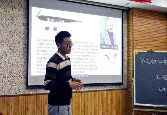 邓芳同学伴着背景音乐声情并茂的演讲感染着在场的观众,孙敏坤大气沉稳又不失幽默的演讲获得了观众们的掌声。部分演讲者全程脱稿,还有两名学生尝试用全英文演讲的形式阐释他们对中国梦和初心的理解,令人耳目一新。