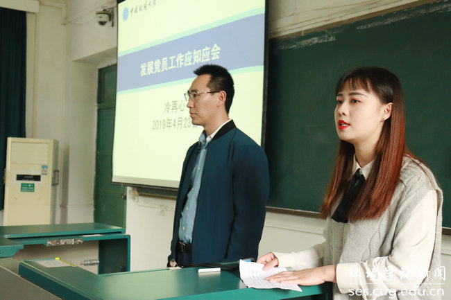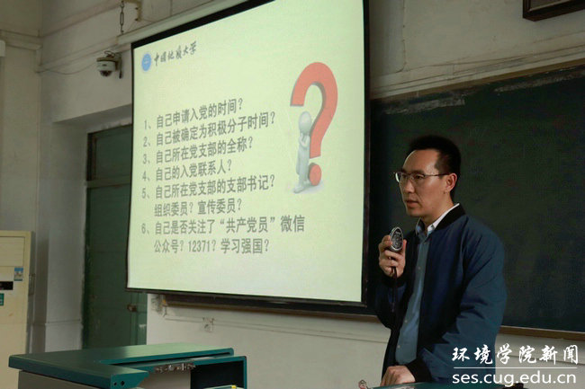 冷再心老师从四个部分讲解了我校发展党员工作的基本方针、发展党员工作的程序和要求、发展党员工作常见问题以及发展党员有关材料的写法。细致解答了环境学子有关发展党员工作的问题并结合实例强调发展党员工作的重要性。