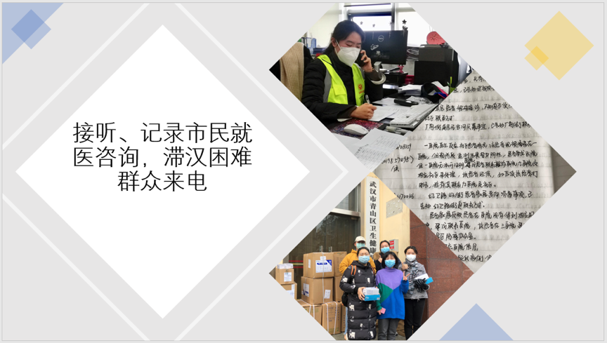 后一阶段则专门负责区卫健委就医咨询接听市民来电,为他们在就医方面作出指引,以及在民政部门做外地滞汉人员求助的志愿工作。如果说前期搬运物资的工作是需要体力与时间,后期接听市民来电的工作则需要的更多是耐心、细心以及坚定的信心。来电话咨询的多是新冠肺炎及各慢性、重症疾病的患者或是家属以及滞留武汉的外地人员。他们的生理、心理已经因为这场疫情变得很脆弱了,更加需要让他们感受到支持与关心。所以,对于他们的问题我尽量用简单易懂的方式回答,希望可以解决他们的燃眉之急,对于他们的投诉抱怨我也尽量听他们叙述转达,希望可以平息他们的焦躁之情。
