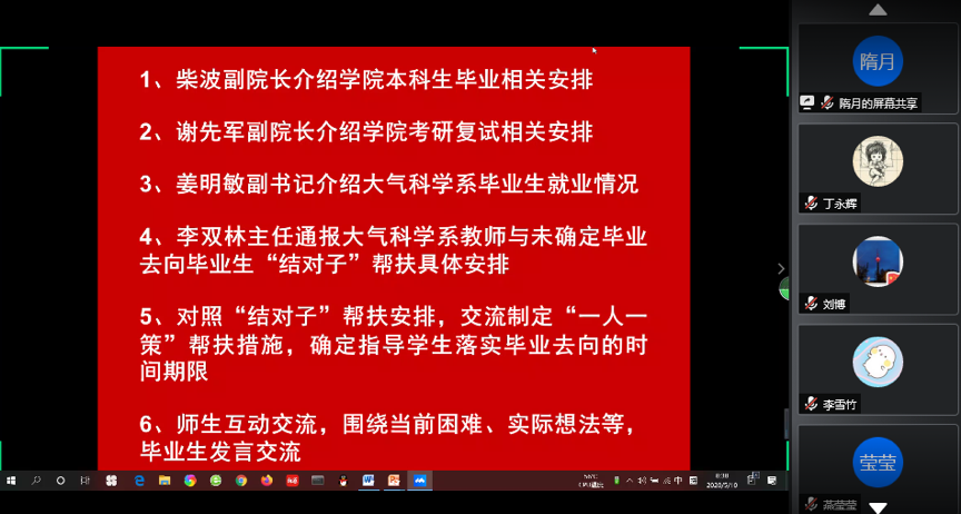副院长柴波、谢先军、党委副书记姜明敏、大气科学系全体教师、毕业年级辅导员、相关专业毕业生参加会议。