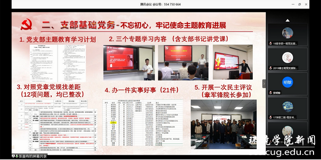 地质学国家基地班本科生党支部在2019年获评第二批全国党建工作样板支部。本次分享中,张曼有同志系统详细地介绍了基地班党支部的建设经验:在基础党务工作中,以“五员五导”夯实党建基础,将基础材料信息化、规范化五表一台账,扎实开展“不忘初心、牢记使命”主题教育,落实学习教育常态化,扎实开展每一项基础党务工作;在特色党建方面,以拔尖创新人才培养为中心,开展基地引航论坛、“地学之光”理论宣讲团、“又红又专地质人”社会实践,培养卓越专业技能、过硬政治素养、远大家国情怀的人才。疫情期间,将主题党日搬到线上,带领身边群众做好疫情防控工作,积极投身疫情防控志愿服务活动。张曼有同志分享结束后,参会的党员同志积极交流请教,纷纷表示要向基地班党支部学习,努力争创标杆党支部。