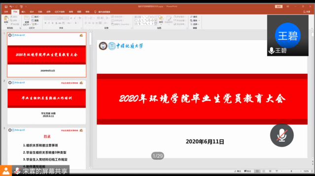 召开毕业生党员教育大会,会议主题为不忘初心牢记使命,争做新时代生态环保铁军。院党委书记李素矿,院党委副书记姜明敏,院分团委书记、三全育人办公室主任、辅导员王碧,院党建创建办公室主任、辅导员宋霖,全体毕业生党员参加会议。会议由王碧老师主持。