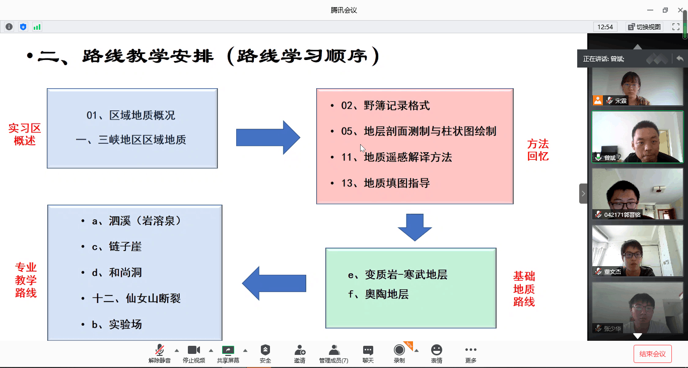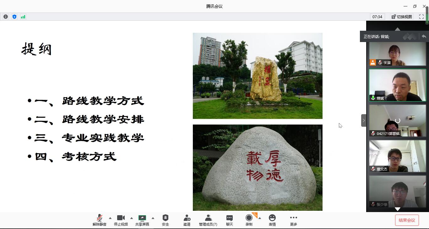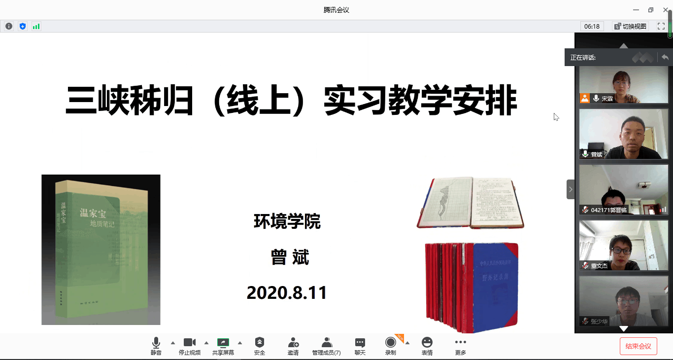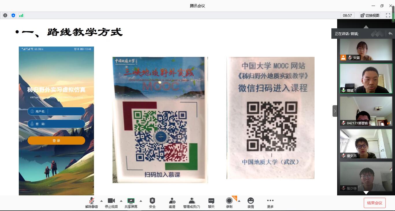 本次线上实习任务讲解分为路线教学实习、路线教学安排、专业实践教学、考核方式四部分,由实习队队长曾斌进行讲解。为保证本次线上教学质量,丰富学习内容,同学们分别要在MOOC三峡地质野外实践完成实习区区域地质认识、在MOOC秭归野外地质实践教学复习回顾野簿记录,地层剖面图绘制及地质填图等工作的方法、在bet365体育投注下载 研发制作的秭归野外实习虚拟仿真软件完成教学路线的学习。同时,还要在MOOC完成环境地质调查思维与实战课程的学习。最后结合在秭归野外实习虚拟仿真软件的测评成绩与实习报告的得分给出最终实习成绩。最后,曾斌强调了野外实践学习的重要性,并鼓励大家只要认真学习,在线上学习也能收获满满!