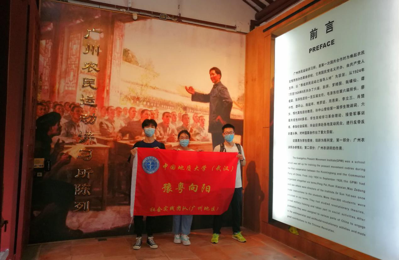 “豫粤向阳”社会实践团的郭玥、刘宇杰、谭昕煜三名同学赴家乡广州市“毛泽东同志主办农民运动讲习所旧址纪念馆”(简称农讲所)开展线下“四史”学习实践活动。
