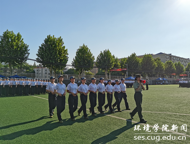 透蓝的天空挂着几抹可爱的云彩,润红的骄阳为天空增添了几分色彩,雄壮的国歌唤醒了同学们的激情,2021级环境学子分为持枪方阵、队列方阵、军体拳方阵以及啦啦操方阵,他们以矫健的步伐、昂扬的姿态、坚毅的眼神、洪亮的口号依次接受检阅。