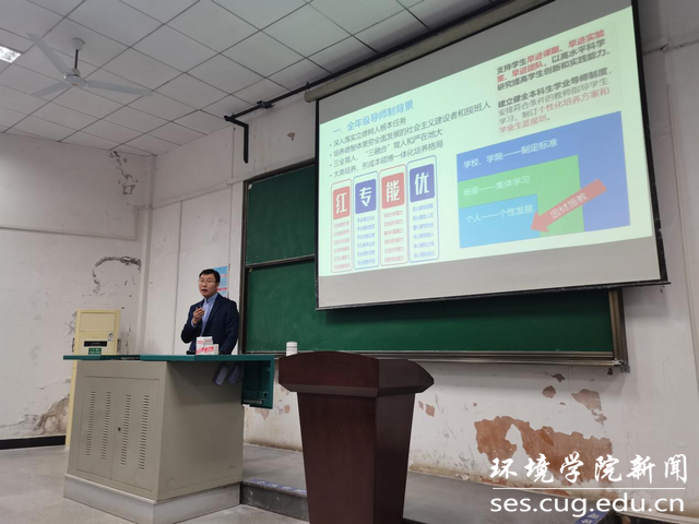 本科生导师双选办法。他以幽默风趣的话语向大家全面介绍全年级导师制的背景、实施办法、导师基本职责、学生须知及其他注意事项。他鼓励大家要通过多种途径了解导师研究方向,寻找个人研究兴趣,争取找到最“志同道合”的导师,勉励大家在科研训练中要认真、踏实、多思、多问,努力培养和提高自身的科研能力与创新思维,争做新时代红专能优的生态环保铁军。