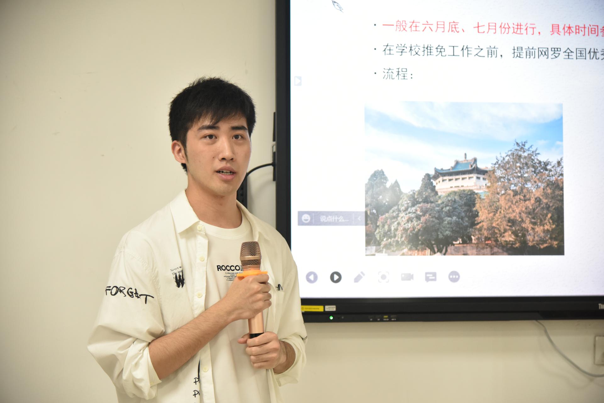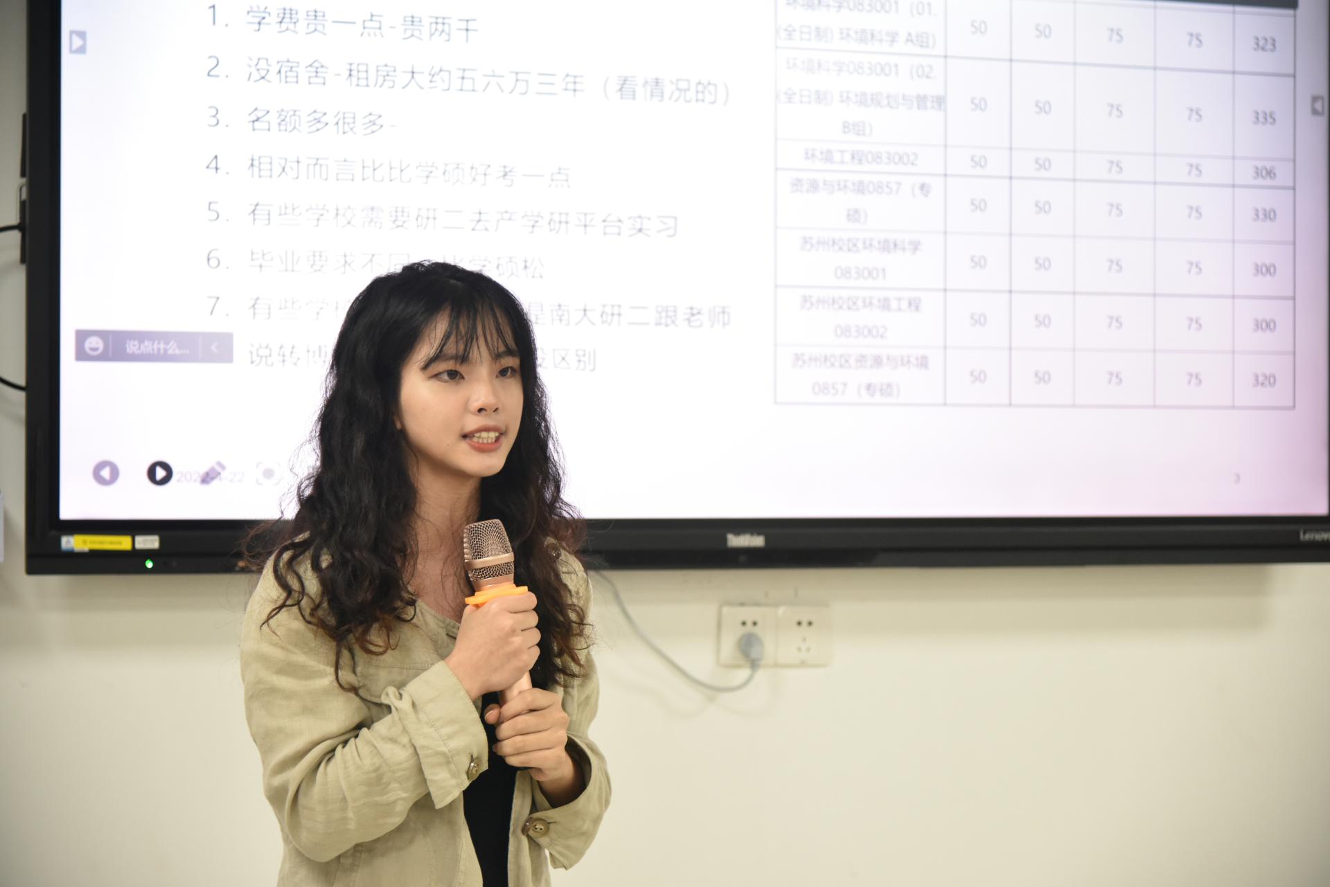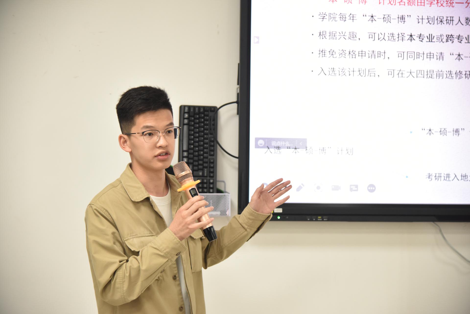 推免方案等方面进行了详尽的讲解,鼓励同学们尽早确定方向,找准自己的专业目标,努力提升自身水平和综合素质;贺沁文通过我校“本硕博”贯通培养计划获得保研推免资格,将攻读bet365体育投注下载环境科学与工程专业(直博),他就计划介绍、参选条件、录取流程、前期流程等方面对该计划进行介绍,建议同学们慎重抉择,提前做好规划,尽早与导师取得联系,在保研之路上放平心态、张弛有度。