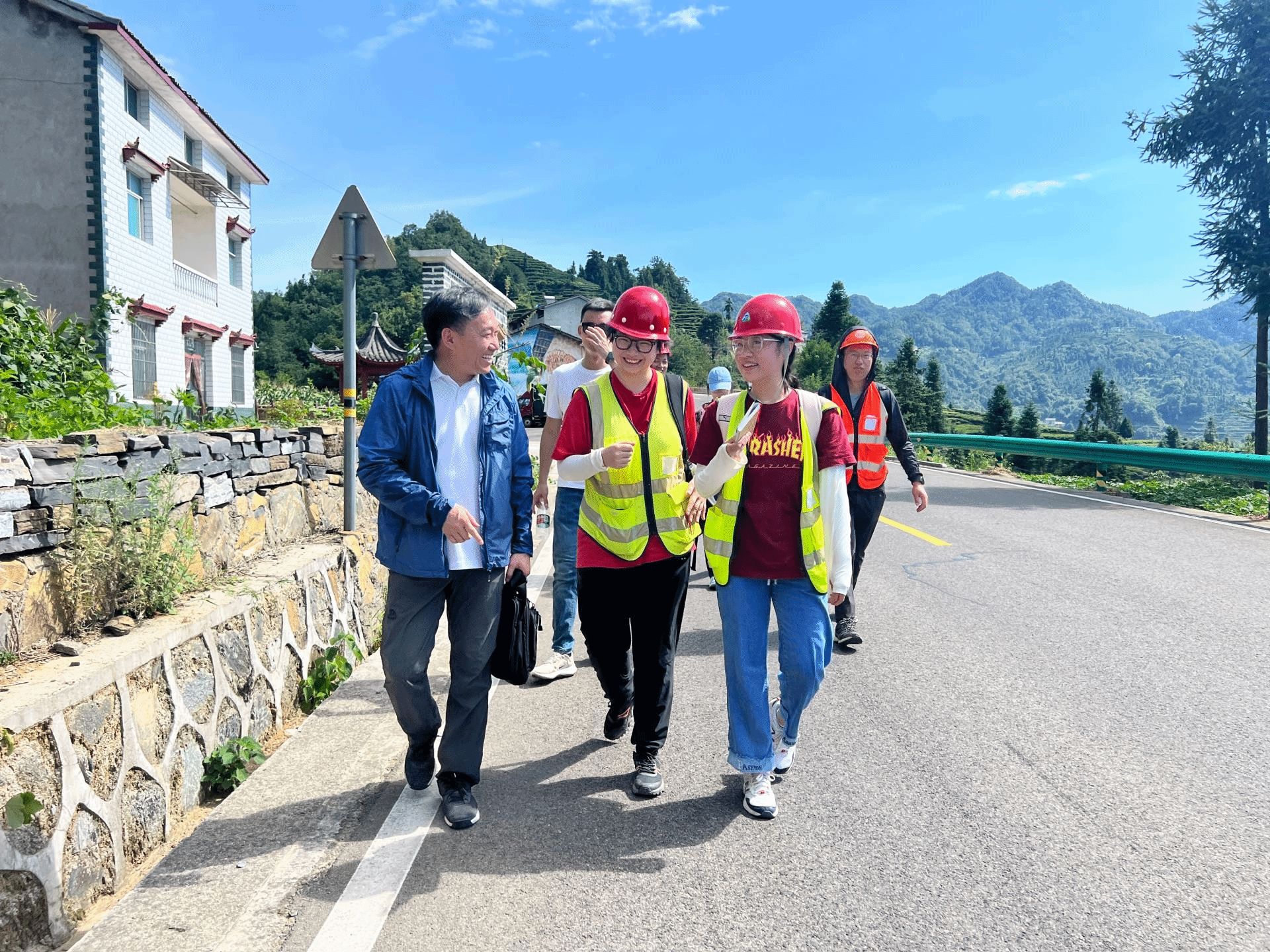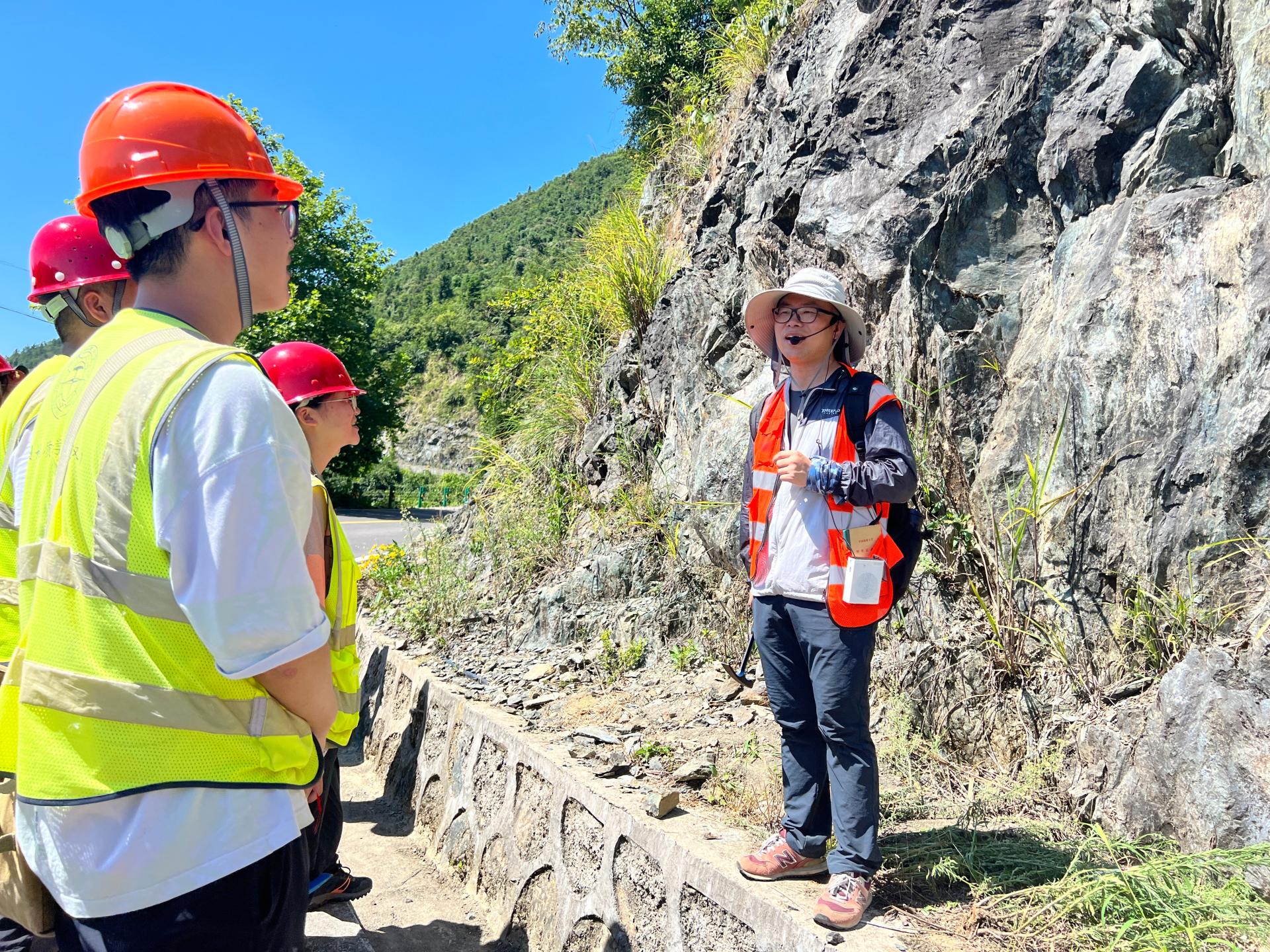 8月9日,李素矿一行跟随中加项目地下水科学与工程专业045211和045212班参加邓村野外实习教学路线。在实习队长王伟老师的讲解中,他和同学们一起,观察认识扬子克拉通最古老的变质岩基底,了解了太古代、古元古代、新元古代地层岩性特点,认识变质岩的特征,感受地质历史沧海桑田的变迁演化。同时,询问了解村民茶叶种植、子女教育、基础医疗、环境卫生、生活质量等情况。