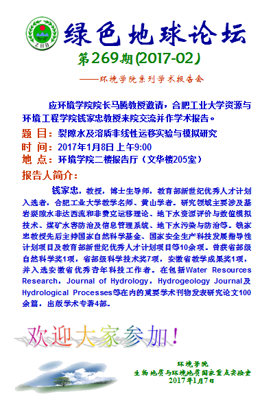 钱家忠,教授,博士生导师,教育部新世纪优秀人才计划入选者,合肥工业大学教学名师、黄山学者。研究领域主要涉及基岩裂隙水非达西流和非费克运移理论、地下水资源评价与数值模拟技术、煤矿水害防治及信息管理系统、地下水污染与防治等。钱家忠教授先后主持国家自然科学基金、国家安全生产科技发展指导性计划项目及教育部新世纪优秀人才计划项目等10余项。曾获省部级自然科学奖1项,省部级科学技术奖7项,安徽省教学成果奖1项,并入选安徽省优秀青年科技工作者。在包括Water Resources Research,Journal of Hydrology,Hydrogeology Journal及Hydrological Processes等在内的重要学术刊物发表研究论文100余篇,出版学术专著4部。