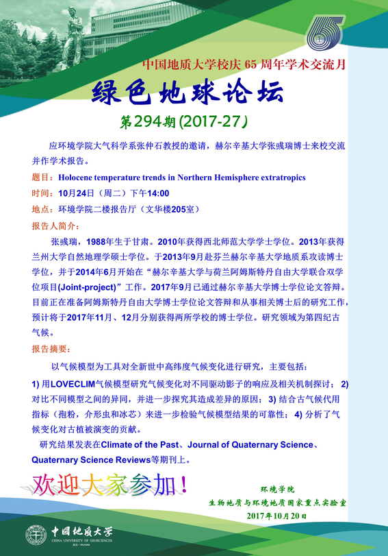 绿色地球论坛第294期(2017-27) ——bet365体育投注下载 系列学术报告会 题目:Holocene temperature trends in Northern Hemisphere extratropics 时间:2017年10月24日(周二)下午14:00 地点:bet365体育投注下载 二楼学术报告厅(文华楼205室)
