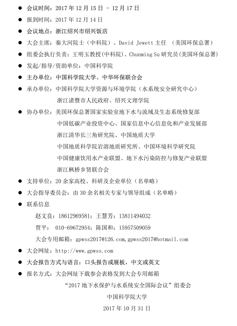 (水系统安全研究中心)与浙江诸暨市政府等联合承办的"2017地下水保护与水系统安全国际会议"将于12月15日-16日在浙江绍兴市举行,大会主席为秦大河院士及美国EPA的David Jewett主任,预计规模300人,大会主题为产学研资政深度融合下的水资源安全利用与水环境综合防治。