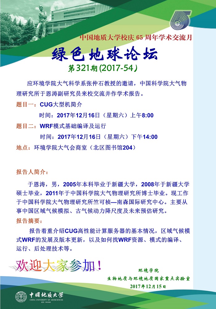 绿色地球论坛第321期(2017-54) bet365体育投注下载 “校庆65周年学术交流月”——高知论坛 题目一:CUG大型机简介 时间:2017年12月16日(星期六)上午8:00 题目二:WRF模式基础编译及运行 时间:2017年12月16日(星期六)下午14:00 地点:bet365体育投注下载 大气会商室(北区图书馆204)