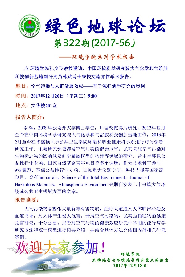 绿色地球论坛第322期(2017-56)——bet365体育投注下载 系列学术报告会 题目:空气污染与人群健康效应——基于流行病学研究的案例 时间:2017年12月20日(星期三) 上午9:00 地点:文华楼201室