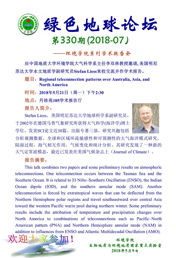 绿色地球论坛第330期(2018-7) ——bet365体育投注下载 系列学术报告会 题目:Regional teleconnection patterns over Australia,Asia, and North America 时间:2018年5月21日(周一)下午14:30 地点:丹桂苑105学术报告厅