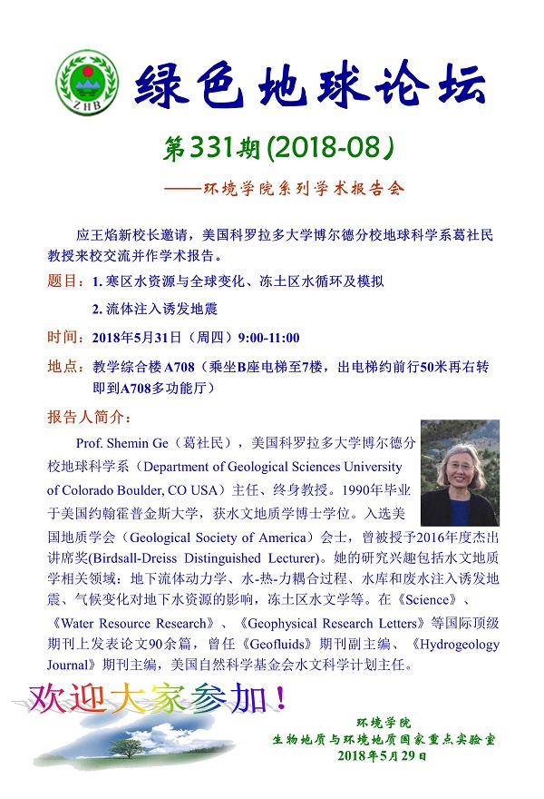 绿色地球论坛第331期(2018-8) ——bet365体育投注下载 系列学术报告会 题目: 1. 寒区水资源与全球变化、冻土区水循环及模拟 2. 流体注入诱发地震 时间:2018年5月31日(周四)9:00-11:00 地点:教学综合楼 A708(乘坐B座电梯至7楼,出电梯约前行50米再右转即到 A708多功能厅)