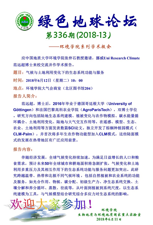 绿色地球论坛第336期(2018-13) ——bet365体育投注下载 系列学术报告会 题目:气候与土地利用变化下的生态系统功能与服务 时间:2018年6月12日上午10:00 地点:bet365体育投注下载 大气会商室(北区图书馆204)