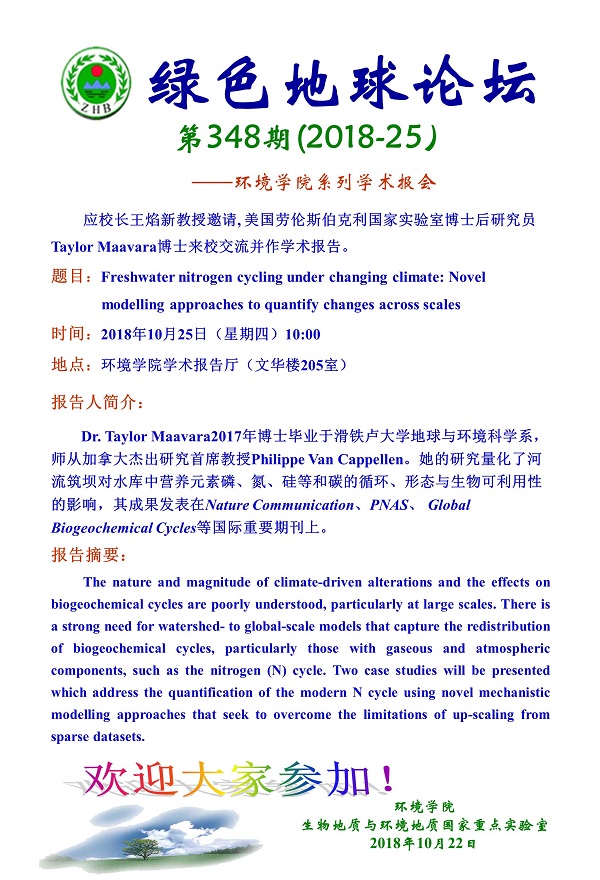 绿色地球论坛第348期(2018-25) ——bet365体育投注下载 系列学术报告会 题目:Freshwater nitrogen cycling under changing climate: Novel modelling approaches to quantify changes across scales 时间:2018年10月25日(周四)上午10:00 地点:bet365体育投注下载 学术报告厅(文华楼205室)