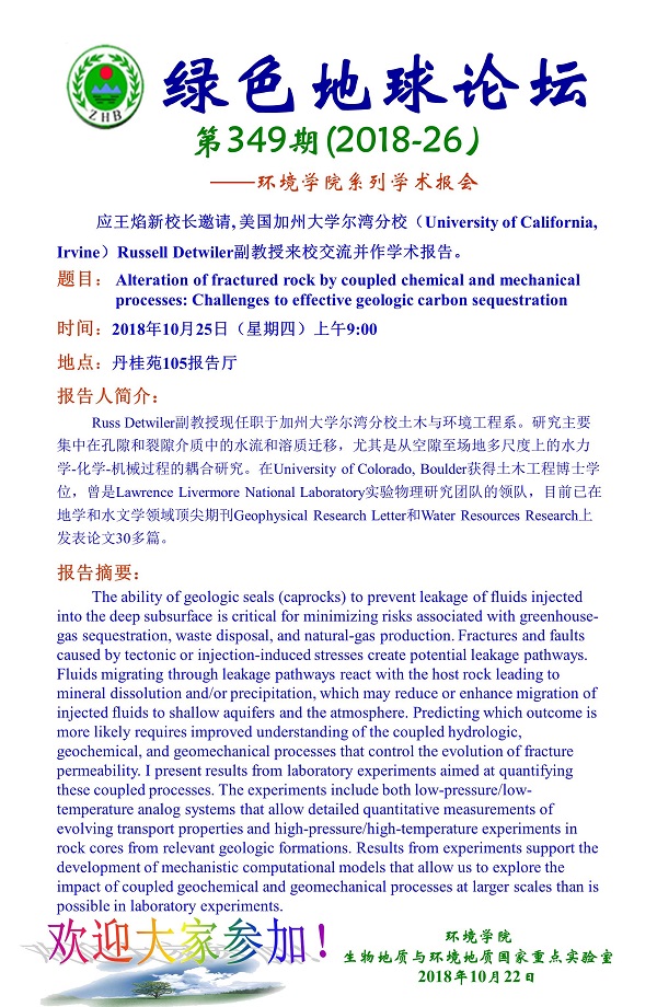绿色地球论坛第349期(2018-26) ——bet365体育投注下载 系列学术报告会 题目:Alteration of fractured rock by coupled chemical and mechanical processes: Challenges to effective geologic carbon sequestration 时间:2018年10月25日(周四)上午9:00 地点:丹桂苑105报告厅