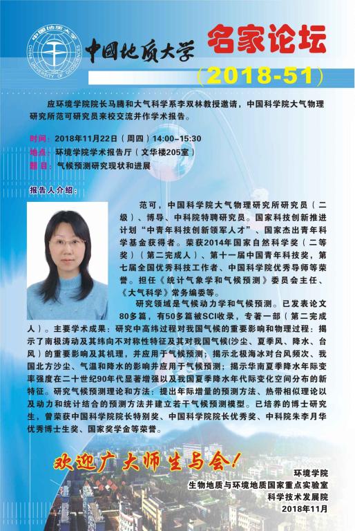 名家论坛(2018-51) 题目:气候预测研究现状和进展 时间:2018年11月22日(周四)14:00 地点:bet365体育投注下载 学术报告厅(文华楼205室)
