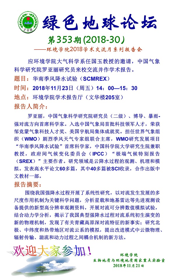 绿色地球论坛第353期(2018-30) ——bet365体育投注下载 2018学术交流月系列报告会 题目:华南季风降水试验(SCMREX) 时间:2018年11月23日(周五)14:00—15:30 地点:bet365体育投注下载 学术报告厅(文华楼205室)