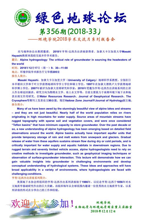 绿色地球论坛第356期(2018-33) ——bet365体育投注下载 2018学术交流月系列报告会 题目:Alpine hydrogeology: The critical role of groundwater in sourcing the headwaters of the world 时间:2018年12月17日(周一)9:30—11:00 地点:bet365体育投注下载 学术报告厅(文华楼205室)