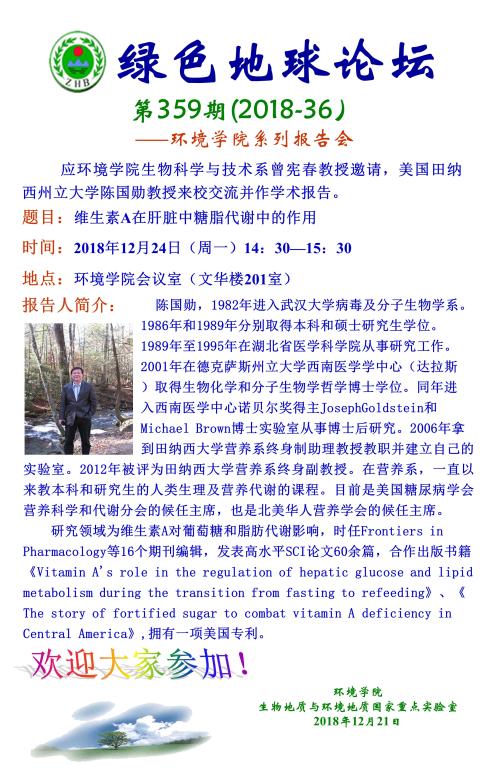 绿色地球论坛第359期(2018-36) ——bet365体育投注下载 系列学术报告会 题目:维生素A在肝脏中糖脂代谢中的作用 时间:2018年12月24日(周一)14:30 地点:bet365体育投注下载 会议室(文华楼201室)