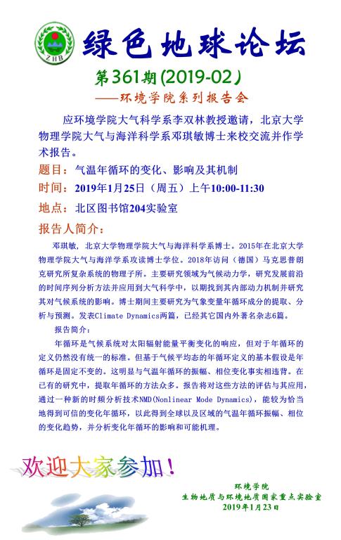 绿色地球论坛第361期(2019-02) ——bet365体育投注下载 系列学术报告会 题目:气温年循环的变化、影响及其机制 时间:2019年1月25日(周五)10:00—11:30 地点:北区图书馆204实验室