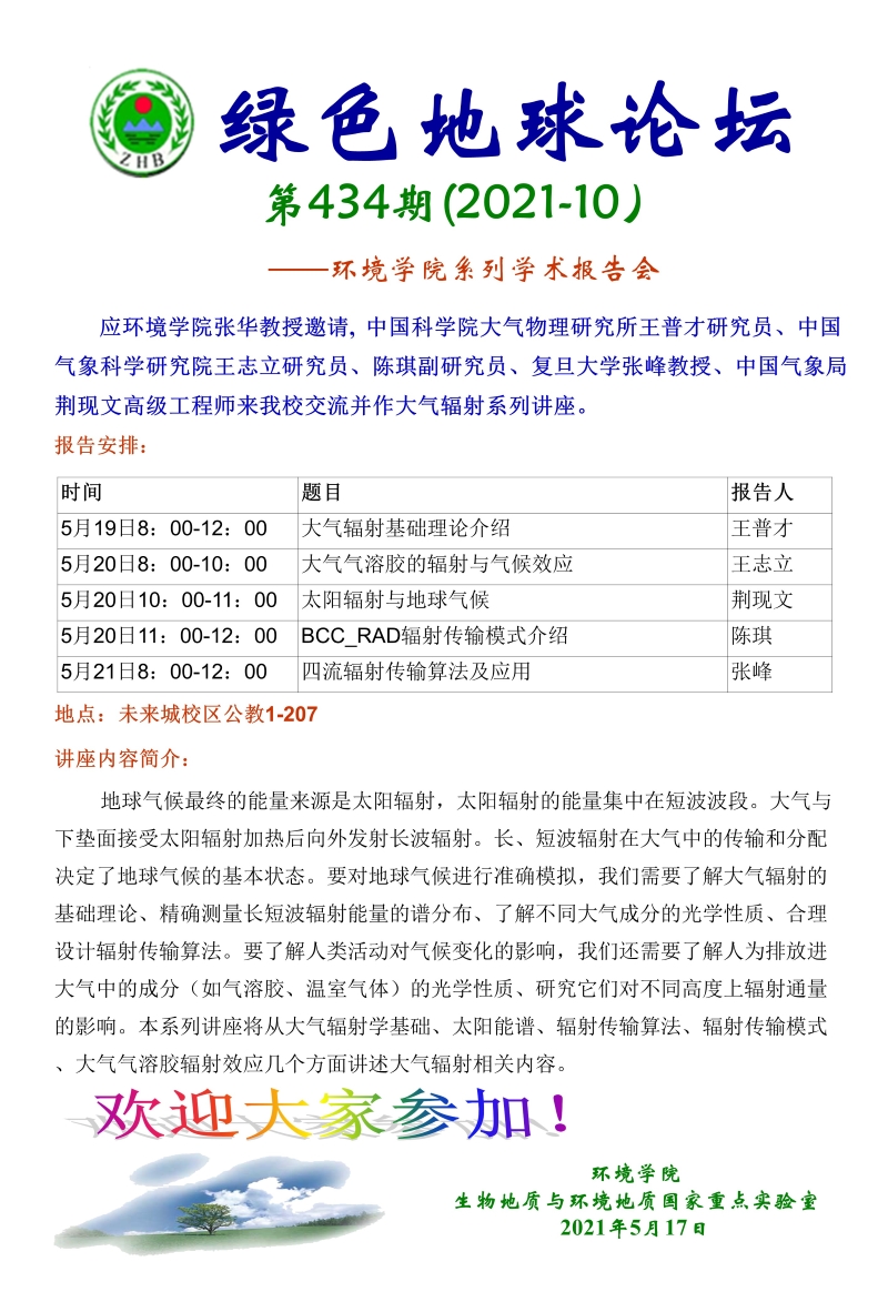 中国科365体育投注 大气物理研究所王普才研究员、中国气象科学研究院王志立研究员、陈琪副研究员、复旦大学张峰教授、中国气象局荆现文高级工程师作大气辐射系列讲座
