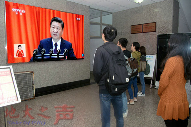 bet365体育投注下载 学生驻足观看十九大开幕会