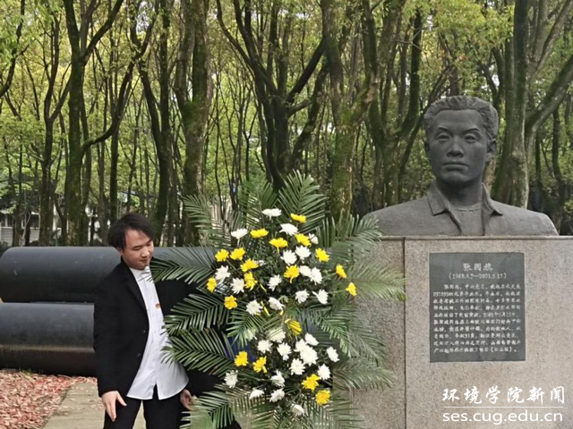 胡治翔作为学生代表向张国旗塑像敬献花篮。全体默哀一分钟。