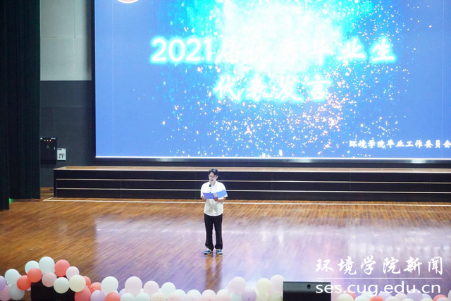 毕业典礼上,博士毕业生刘珊代表全体研究生毕业生发言,她讲述了自己在地大十年的故事。她提到,从本科入学到博士毕业,她见证了西区图书馆的修建,东区的双子楼建成,隧道壁画从一幅小熊小猪的泰坦尼克涂鸦到布满了色彩缤纷的社团宣传画,新校区拔地而起,地大人上天、入地、下海、登极,同学们也成为了更好的自己。她谈到,地大十年,第一个收获是坚持,研究生阶段在导师的指导下进行实验操作和论文撰写时,真正体会到坚持使身处低谷人心怀希望,困难重重仍坚定前行,这是一种严谨认真和精益求精的工匠精神,地大bet365体育投注下载 的学科高度和学术声誉正是来自于老师和同学们对于不断追寻真理、突破自我的坚持!第二个收获是行动。武汉军运会期间,大气环境师生团队服务保障军运会大气污染管控,让“武汉蓝”成为军运会最美的背景板。新冠肺炎疫情期间,刘珊参加了王焰新院士牵头武汉市新冠肺炎应急专项,她真切体会到用行动诠释使命,用心守卫绿水青山。第三个收获是担当。从张国旗校友的故事中汲取力量,成为“政治强、本领高、作风硬、敢担当,特别能吃苦、特别能战斗、特别能奉献”的新时代生态环保铁军的一员。最后,她表达了对母校母院的感激和不舍,勉励全体学生在未来的生活中有幸福、能担当、有成就。